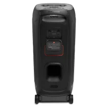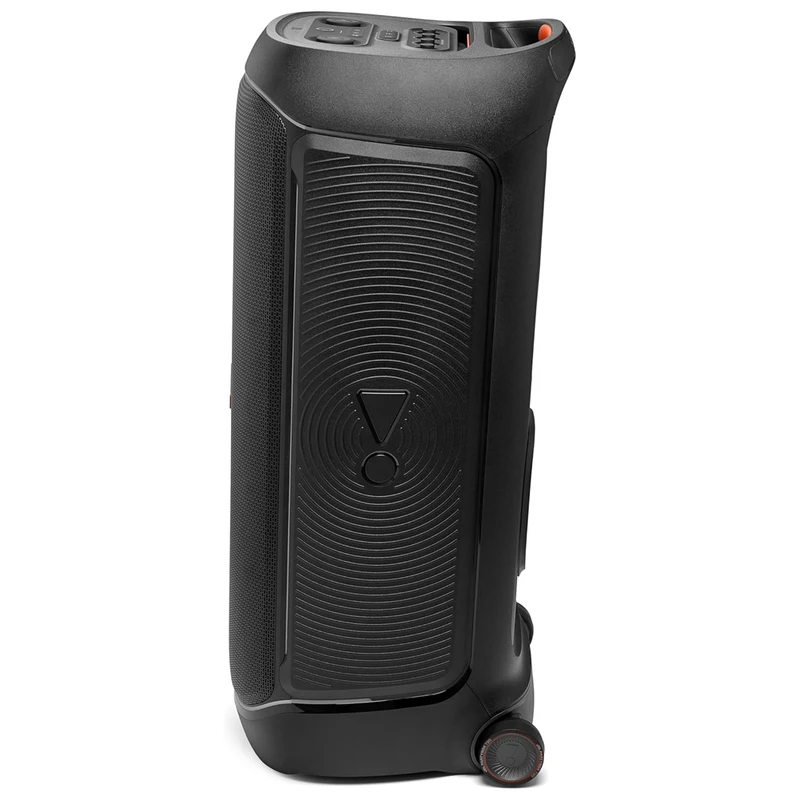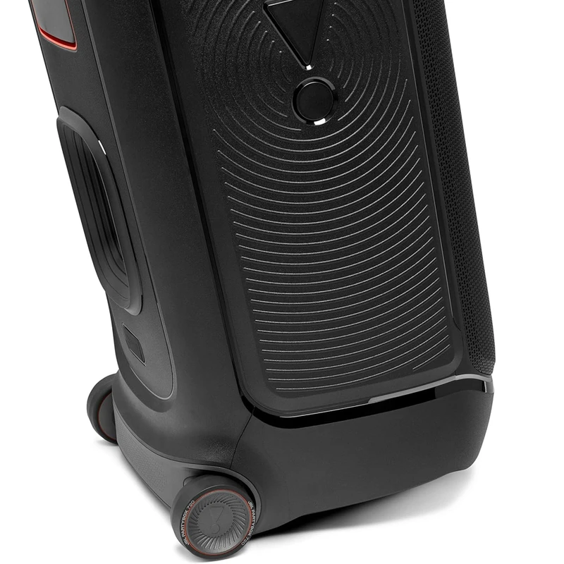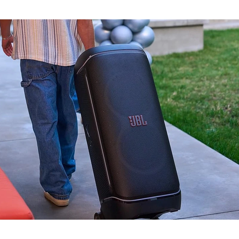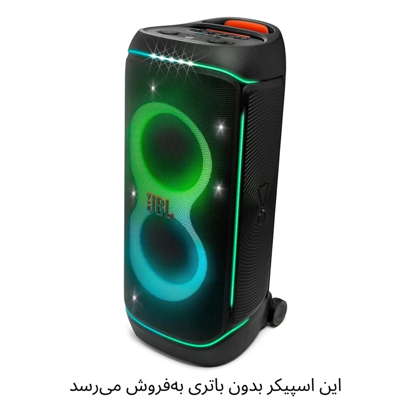 (این اسپیکر بدون باتری بهفروش میرسد) – اسپیکر بلوتوثی قابل حمل جی بی ال مدل PartyBox 720، یک غول صوتی ۳۱ کیلوگرمی با ابعاد ۴۰۶x۹۴۲x۴۱۶ میلیمتر است که با بدنهای از جنس پلاستیک و چرخ و دستگیره ثابت طراحی شده تا جابهجایی آن آسان باشد، این دستگاه قدرتمند با توان خروجی کلی ۸۰۰ وات، صدای JBL Pro Sound را از طریق دو سابووفر ۹ اینچی و دو توییتر ارائه میدهد و پاسخ فرکانسی گستردهای بین ۳۲ تا ۲۰۰۰۰ هرتز دارد، همچنین با بهرهگیری از فناوری AI Sound Boost کیفیت خروجی صدا را بهینه میسازد و به واسطه گواهی مقاومت در برابر پاشش آب و گرد و غبار، برای فضاهای باز نیز مناسب است، نورپردازی دینامیک و هماهنگ با ریتم موسیقی (نور RGB) یکی از ویژگیهای برجسته این اسپیکر است که از طریق اپلیکیشن JBL PartyBox قابل تنظیم است، اتصالات آن بسیار کامل است و شامل بلوتوث نسخه ۵.۴ با پروفایلهای A۲DP و AVRCP، ورودیهای AUX، USB Type-C، دو ورودی XLR برای اتصال میکروفون یا گیتار الکتریک و قابلیت Auracast برای اتصال چندین اسپیکر میشود. علاوه بر آن، دکمه Bass Boost و قابلیتهای تنظیم اکولایزر و حالتهای مختلف پخش صدا برای شخصیسازی تجربه شنیداری در آن تعبیه شده است.