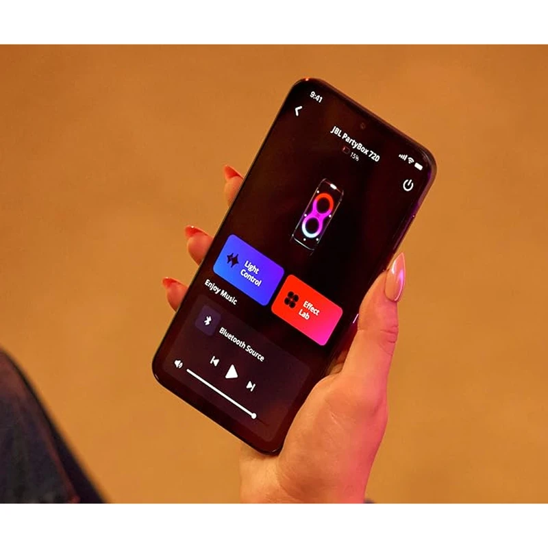 - اتصال به اپلیکیشن: این قطعیترین روش است. اسپیکر اصلی PartyBox 720 باید بلافاصله توسط اپلیکیشن JBL PartyBox App در گوشی موبایل شناسایی شود. هیچ ورژن فیکی تاکنون نتوانسته پروتکلهای نرمافزاری جیبیال را هک کند. اگر اسپیکر به بلوتوث وصل میشود اما اپلیکیشن آن را نمیشناسد، قطعاً تقلبی است.