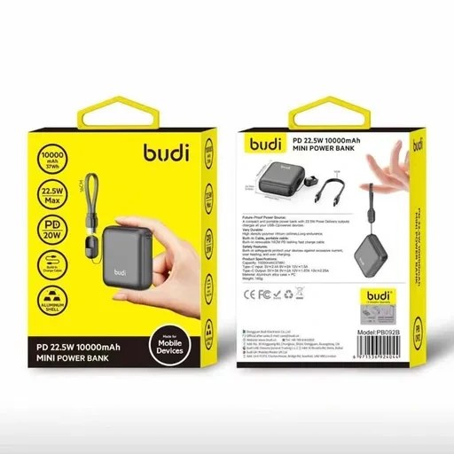 پاوربانک بودی توان 22.5 وات بودی مدل Budi PB092B با 3 پورت خروجی و کابل USB-C ظرفیت 10000 میلی آمپر ساعت